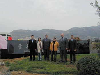 | 雷德曼的股東們?cè)趶S牌前留影,廠名由著名書法大師邵先生題寫 |